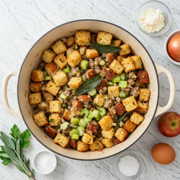 Use day-old or toasted bread to avoid soggy stuffing. The browned sage butter with apple cider is the key flavor element, don’t skip it. For extra crispiness, broil the top for 1–2 minutes before serving. Can be made ahead, refrigerated overnight, and baked the next day.