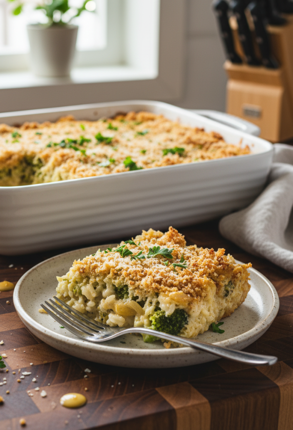 Description: A classic Southern comfort dish elevated with a from-scratch cheese sauce featuring sharp cheddar and nutty Gruyère, tender-crisp broccoli, and the rich, sweet flavor of slow-caramelized onions. Topped with a crunchy panko-Parmesan crust, this is the ultimate broccoli rice casserole.