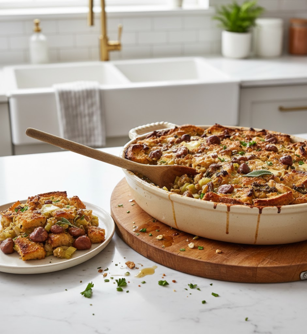 Description: A sophisticated and deeply flavorful dressing made with toasted sourdough, sweet leeks, earthy chestnuts, and a secret umami-rich twist from white miso paste. It’s the perfect side dish for holidays or any special occasion, boasting a custardy interior and a perfectly crisp, golden-brown top.