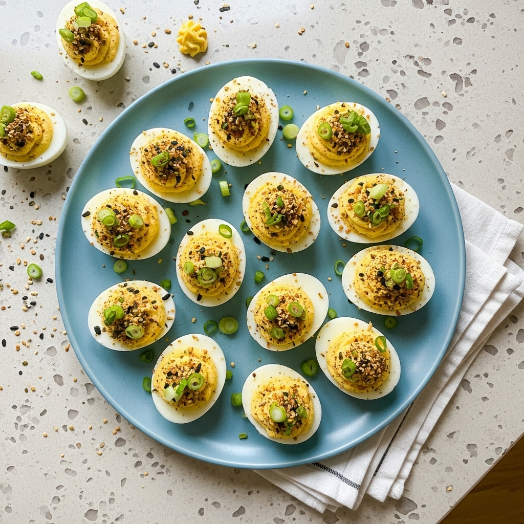 Description: A classic Southern appetizer gets a modern, savory twist. Creamy egg yolk filling is infused with the rich umami of white miso paste and topped with a crunchy, flavorful furikake seasoning for a truly unforgettable deviled egg experience.