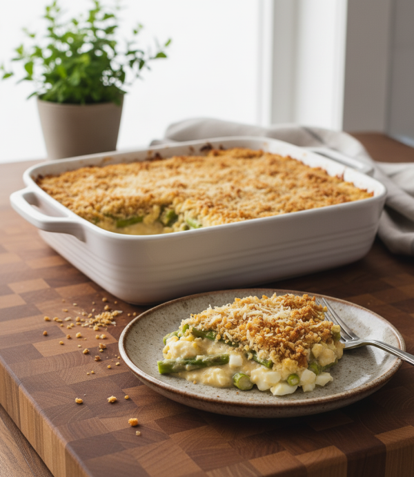The first time I ever had asparagus casserole was at my husband’s family Easter gathering, long before we were even married. His Aunt Carol, a woman with a gift for making magic out of simple ingredients, brought a bubbling dish of creamy, cheesy asparagus that vanished almost as soon as it hit the table. It was warm and nostalgic, the kind of recipe that instantly feels like home. I asked her for the recipe card that same afternoon, and it’s been a family staple ever since.