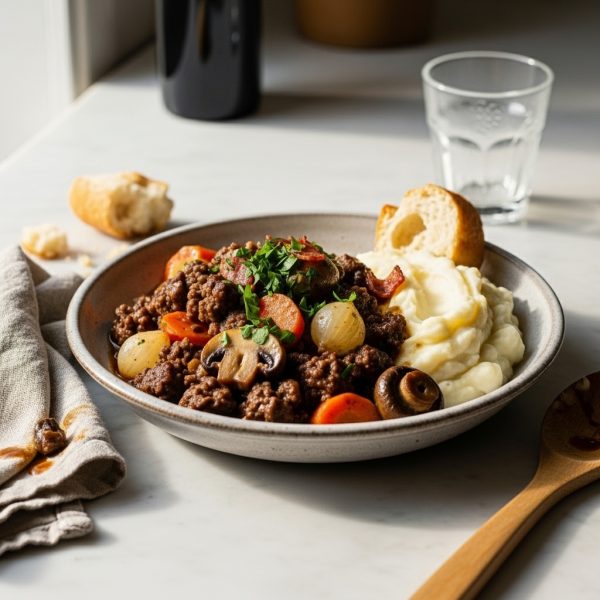 Description: A rich and savory French-inspired stew made easy for any night of the week. This Ground Beef Bourguignon uses lean ground beef and a secret ingredient, porcini mushroom powder, to achieve a deep, slow-simmered flavor in under an hour.