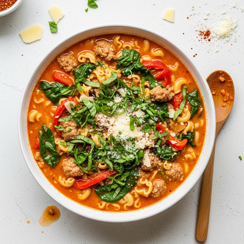 Description: A rich and comforting one-pot soup featuring spicy Italian sausage, tender pasta, and fresh spinach in a velvety broth, elevated with the subtle sweetness of roasted red peppers and a warm, smoky depth from smoked paprika.