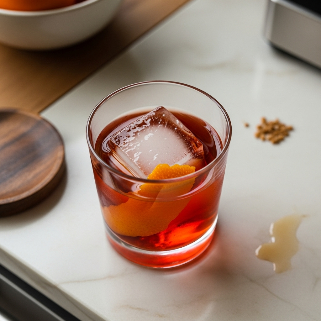 The presentation starts with the right glass and garnish. As mentioned, a handsome rocks glass with a single, crystal-clear large ice cube is the classic and best choice. The vibrant, ruby-red hue of the cocktail looks stunning against a large block of ice. The orange peel garnish is non-negotiable, as its aromatic oils are truly the finishing touch that awakens the senses before the first sip.