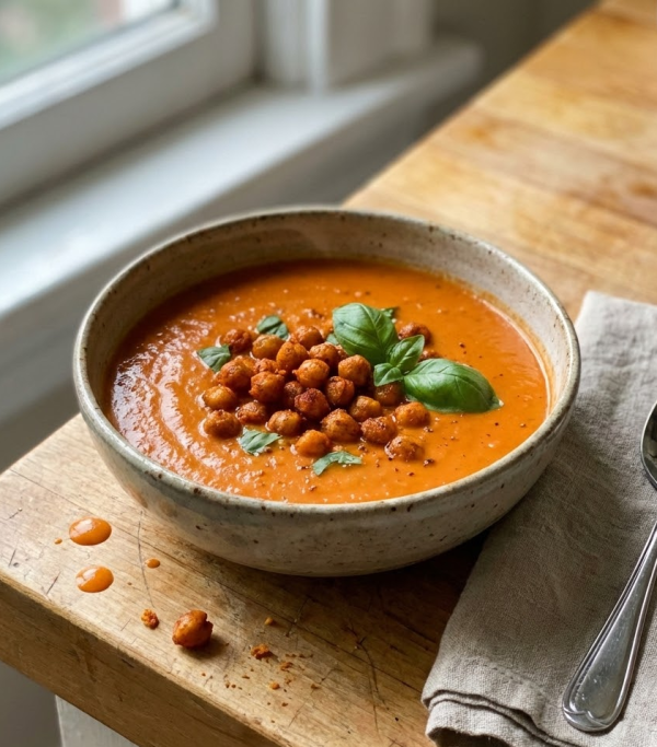 Description: A luxuriously creamy and flavorful tomato soup made entirely plant-based with a secret smoky twist from roasted red pepper and smoked paprika. It’s the ultimate dairy-free comfort food.